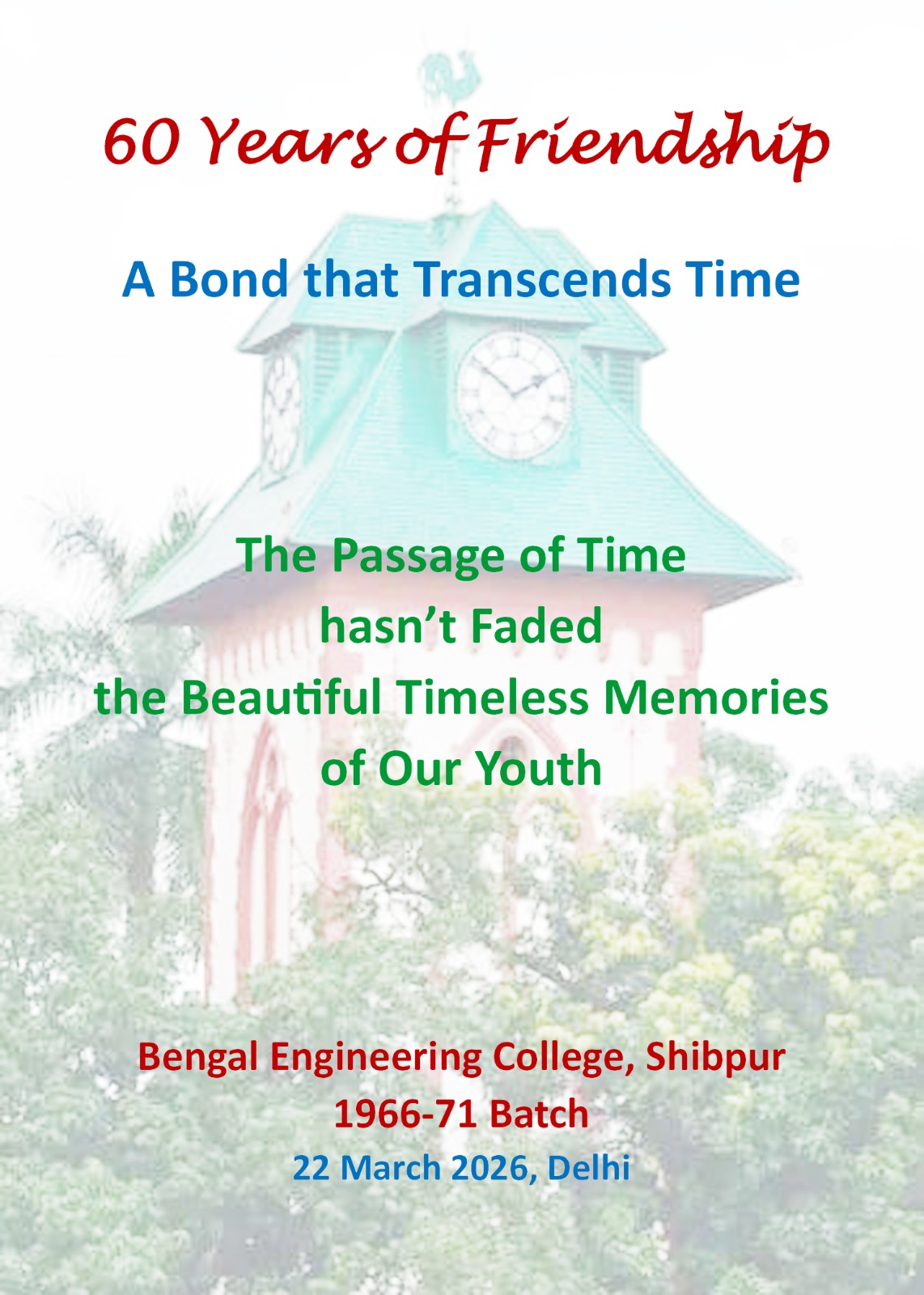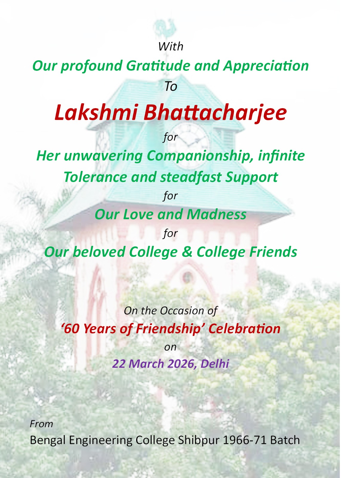 ‘B E College Shibpur 1966-71 Batch’ Celebrated their ’60 Years of Friendship’ in Delhi on 22 March 2026. A Total of 17 (10 Alumni and 7 Spouses) participated in the Celebration. This included 8 Alumni and 5 Spouses from ‘National Capital Region’ (NCR), and 2 Alumni with their Spouse from ‘Kolkata’. The Participants started arriving from around 11:45 am, and the ‘Celebration’ started around 12:15 pm on arrival of All Participants. The ‘Celebration’ was highly successful and continued until around 4:30 pm. The Highlight of the Celebration was the ‘Spouses’ presenting Their Perception & Experience related to Our Beloved College, besides Each Alumni reminiscing about the College. The ‘Planned Program’, Group Photo of All Participants, Photo of ‘Alumni’ sharing His Attachment & Experience related to the College, and Photo of the Table-Top Standee ‘Mementos’ handed to the Participants are presented below.